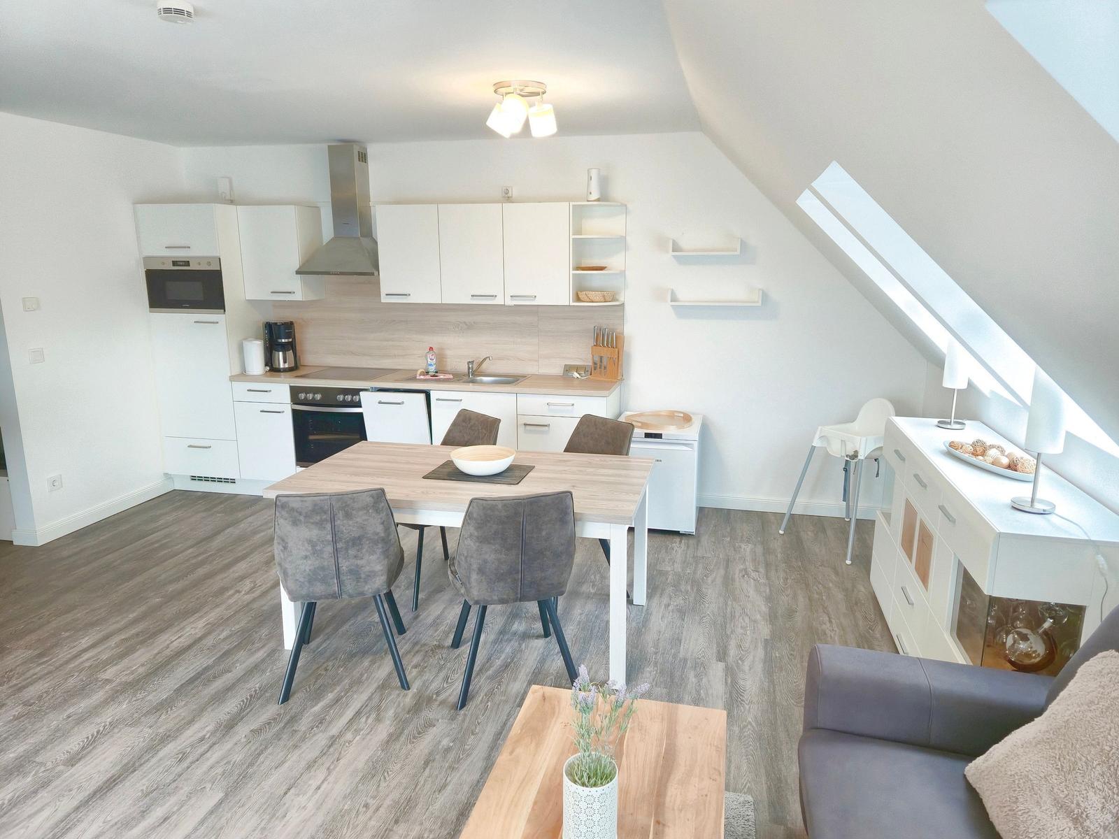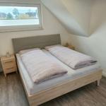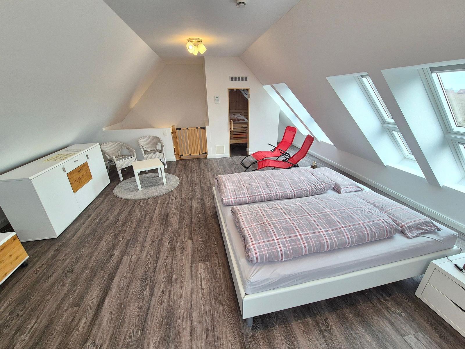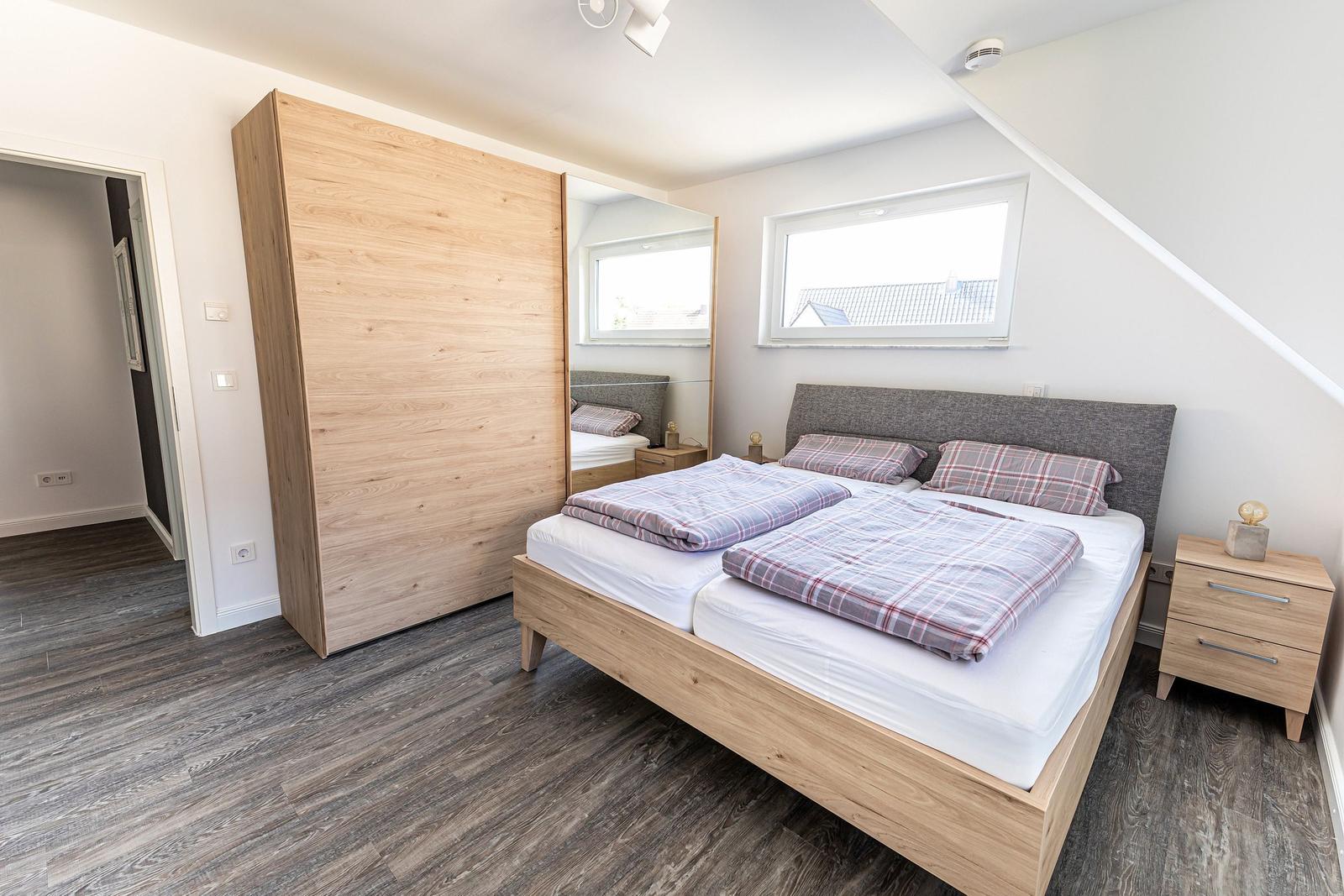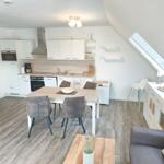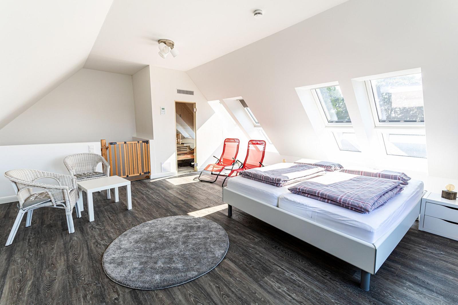Die moderne 3-Zimmer-Wohnung mit einer Fläche von 100 m² ist ein idealer Rückzugsort für bis zu 4 Personen. Der offene Wohn- und Küchenbereich bietet eine bequeme Couch und einen Essplatz für 4 Personen, ideal für gesellige Frühstücke. Die vollausgestattete Küche umfasst unter anderem einen Geschirrspüler und ein 4-Felder-Cerankochfeld. Das untere Schlafzimmer verfügt über ein Doppelbett (1,80 x 2,00 m), einen Kleiderschrank und einen eigenen TV. Das geräumige obere Schlafzimmer ist nur über eine Treppe erreichbar, ausgestattet mit einem Doppelbett (1,80 x 2,00 m), einer Kommode, TV und einer kleinen Sitzecke, sowie einem Zugang zur eigenen Sauna. Das moderne Bad bietet eine ebenerdige Dusche. WLAN ist verfügbar und es gibt einen Fahrradschuppen. Ein Parkplatz steht direkt am Haus zur Verfügung. Haustiere sind nicht erlaubt.