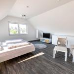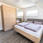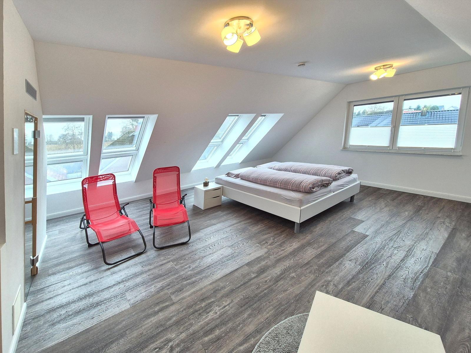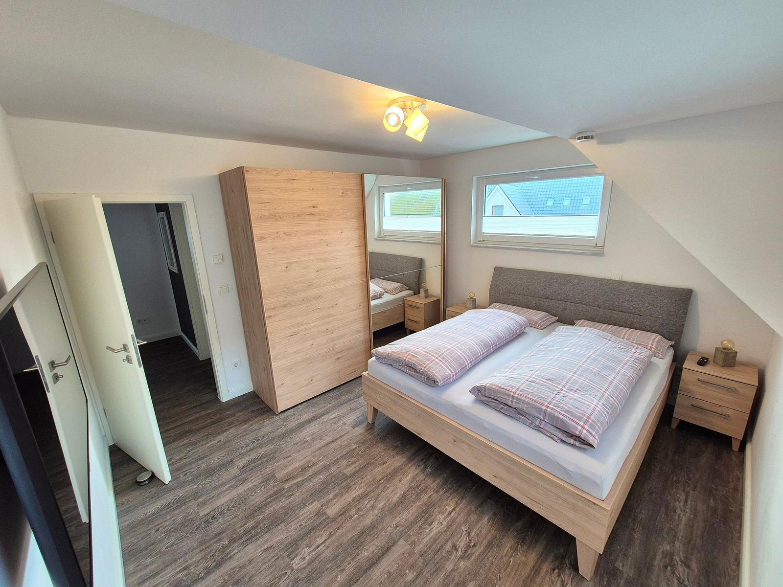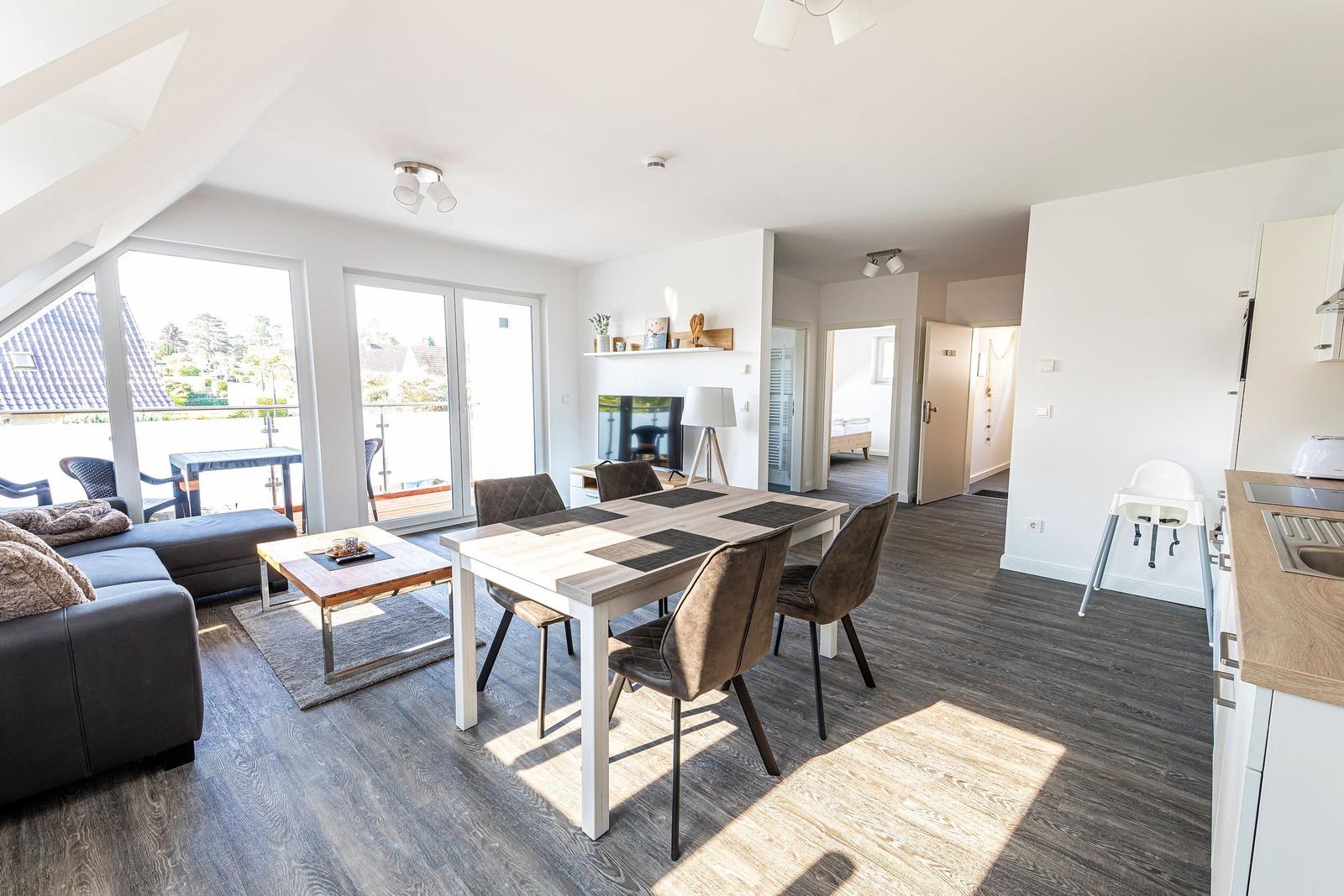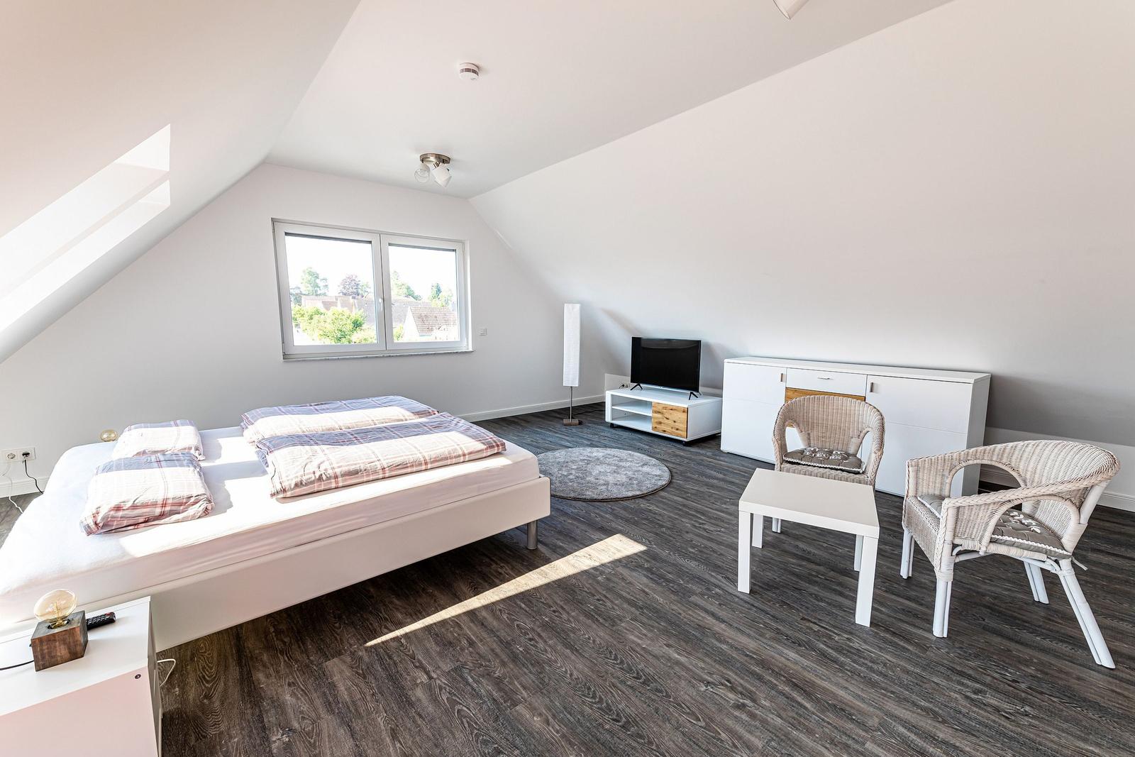 Die moderne 3-Zimmer-Wohnung mit einer Fläche von 100 m² ist ein idealer Rückzugsort für bis zu 4 Personen. Der offene Wohn- und Küchenbereich bietet eine bequeme Couch und einen Essplatz für 4 Personen, ideal für gesellige Frühstücke. Die vollausgestattete Küche umfasst unter anderem einen Geschirrspüler und ein 4-Felder-Cerankochfeld. Das untere Schlafzimmer verfügt über ein Doppelbett (1,80 x 2,00 m), einen Kleiderschrank und einen eigenen TV. Das geräumige obere Schlafzimmer ist nur über eine Treppe erreichbar, ausgestattet mit einem Doppelbett (1,80 x 2,00 m), einer Kommode, TV und einer kleinen Sitzecke, sowie einem Zugang zur eigenen Sauna. Das moderne Bad bietet eine ebenerdige Dusche. WLAN ist verfügbar und es gibt einen Fahrradschuppen. Ein Parkplatz steht direkt am Haus zur Verfügung. Haustiere sind nicht erlaubt.