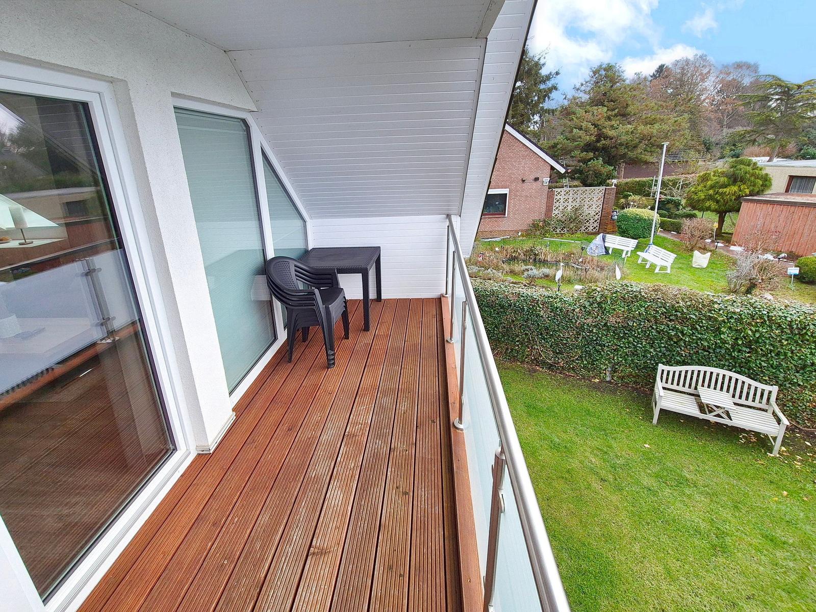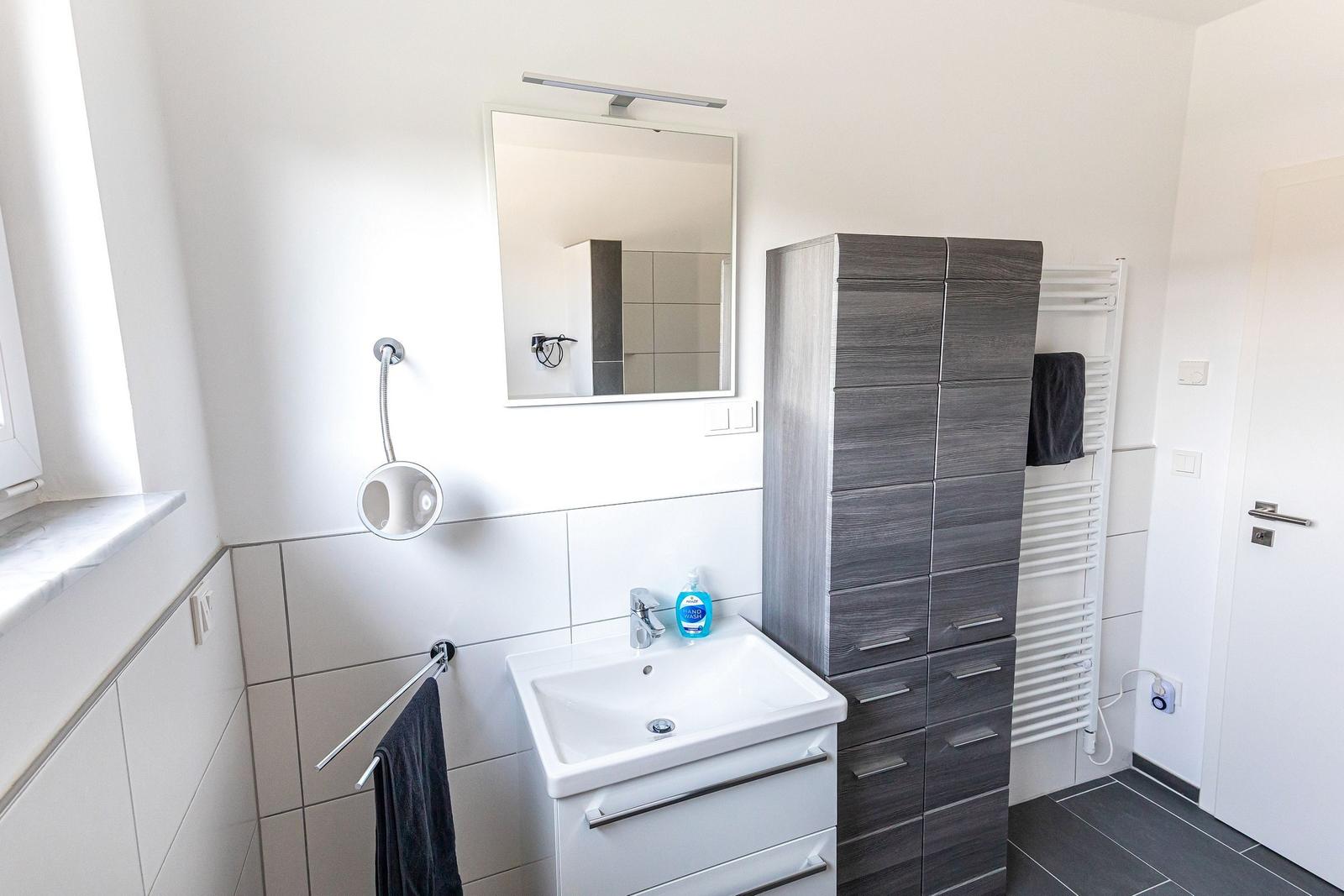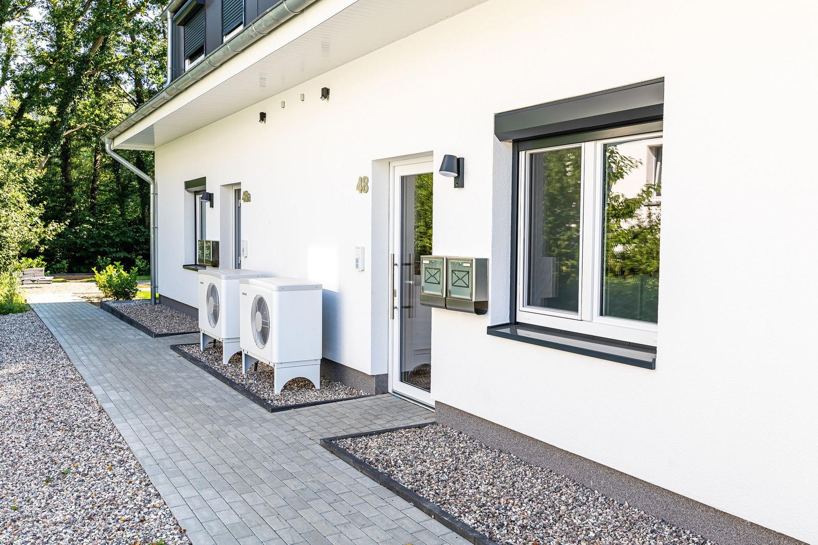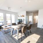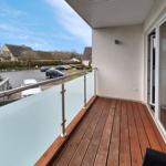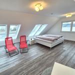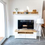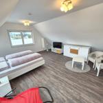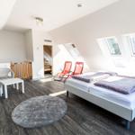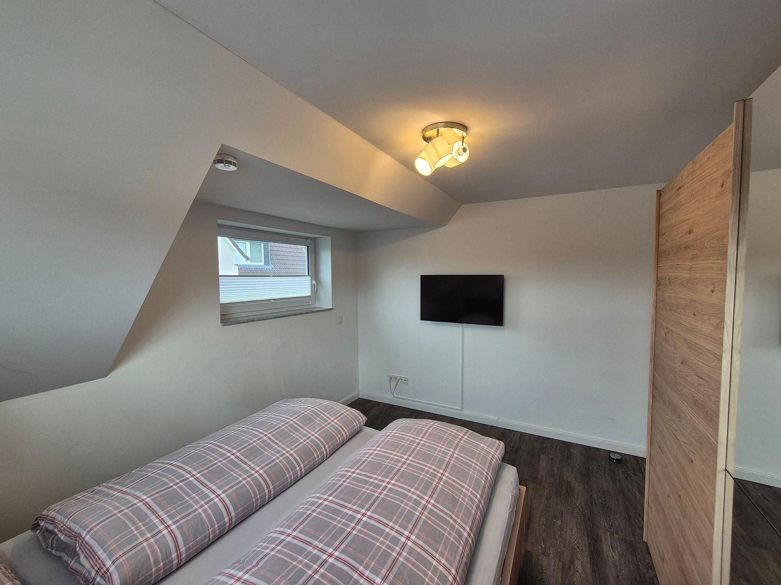 Die moderne 3-Zimmer-Wohnung mit einer Fläche von 100 m² ist ein idealer Rückzugsort für bis zu 4 Personen. Der offene Wohn- und Küchenbereich bietet eine bequeme Couch und einen Essplatz für 4 Personen, ideal für gesellige Frühstücke. Die vollausgestattete Küche umfasst unter anderem einen Geschirrspüler und ein 4-Felder-Cerankochfeld. Das untere Schlafzimmer verfügt über ein Doppelbett (1,80 x 2,00 m), einen Kleiderschrank und einen eigenen TV. Das geräumige obere Schlafzimmer ist nur über eine Treppe erreichbar, ausgestattet mit einem Doppelbett (1,80 x 2,00 m), einer Kommode, TV und einer kleinen Sitzecke, sowie einem Zugang zur eigenen Sauna. Das moderne Bad bietet eine ebenerdige Dusche. WLAN ist verfügbar und es gibt einen Fahrradschuppen. Ein Parkplatz steht direkt am Haus zur Verfügung. Haustiere sind nicht erlaubt.