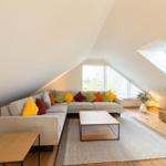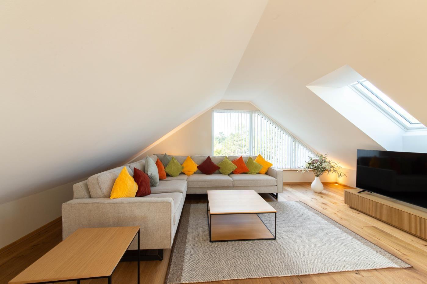 Durch die bodentiefen Fenster wird die Ferienwohnung von Licht durchflutet, bei den Materialien wurde auf Hochwertigkeit und Natürlichkeit gesetzt. Die Farbgebung in sanften Cremetönen sorgt für eine warme Wohlfühlatmosphäre. Die Räume lassen sich durch elektrische Außenraffstores verdunkeln.