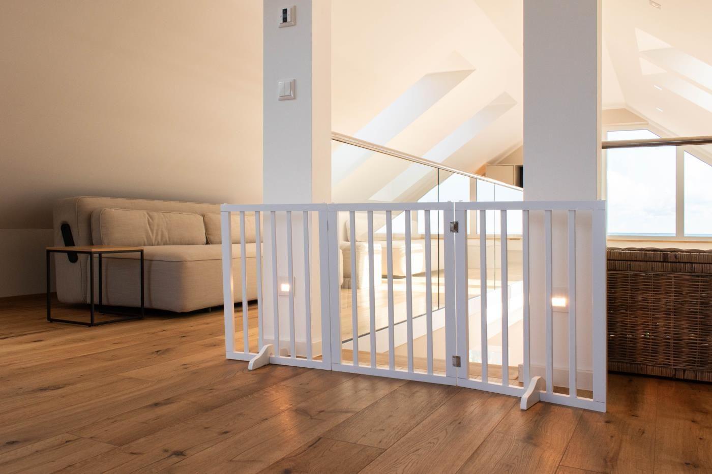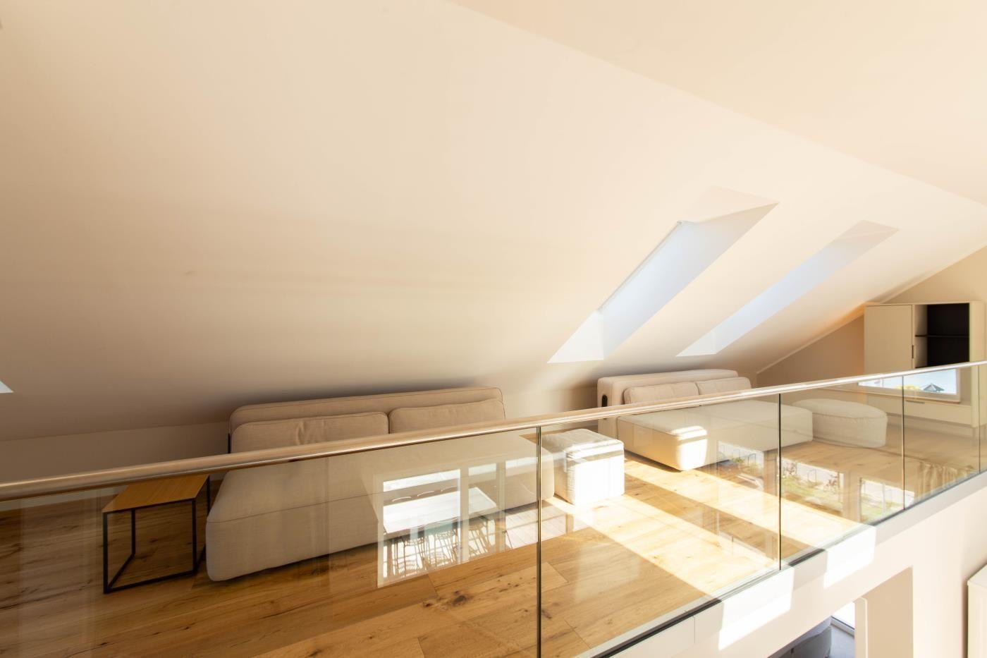 Die Ferienwohnung erstreckt sich mit ca. 125 qm über zwei Etagen. Der offene und lichtdurchflutete Ess- und Küchenbereich ist stilvoll gestaltet und geschickt aufgeteilt. Die Küche ist mit hochwertigen Küchengeräten sowie einer schwarzen Granitarbeitsplatte ausgestattet und lässt keine Wünsche offen. Außerdem gelangen Sie hier auf die 35 qm Dachterresse mit einer Markise sowie einem Heizstrahler, der Meerblick ist wirklich unvergleichlich. Die separaten Schlafzimmer verfügen über gemütliche Doppelbetten (2,00 x 2,00 Meter bzw. 1,80 x 2,00 Meter) sowie Kleiderschränken mit reichlich Stauraum für Ihr Reisegepäck. Eines der Schlafzimmer verfügt über einen direkten Zugang zum Bad ein Suite. Das größere innenliegende Badezimmer punktet mit einer großen ebenerdigen Dusche, einer Waschmaschine und einem WC. Im oberen Bereich der Maisonettewohnung finden Sie den Wohnbereich mit einer Schlafcouch und einer kuscheligen Leseecke. Die Ferienwohnung ist barrierefrei und stufenlos mit dem Fahrstuhl erreichbar, der direkt in die Ferienwohnung führt.