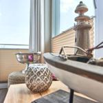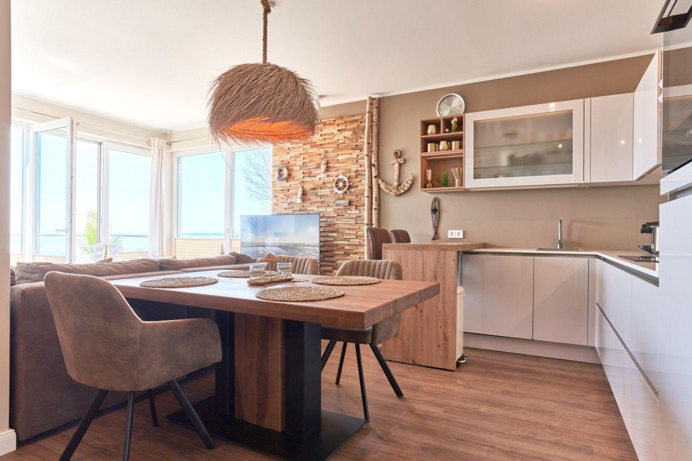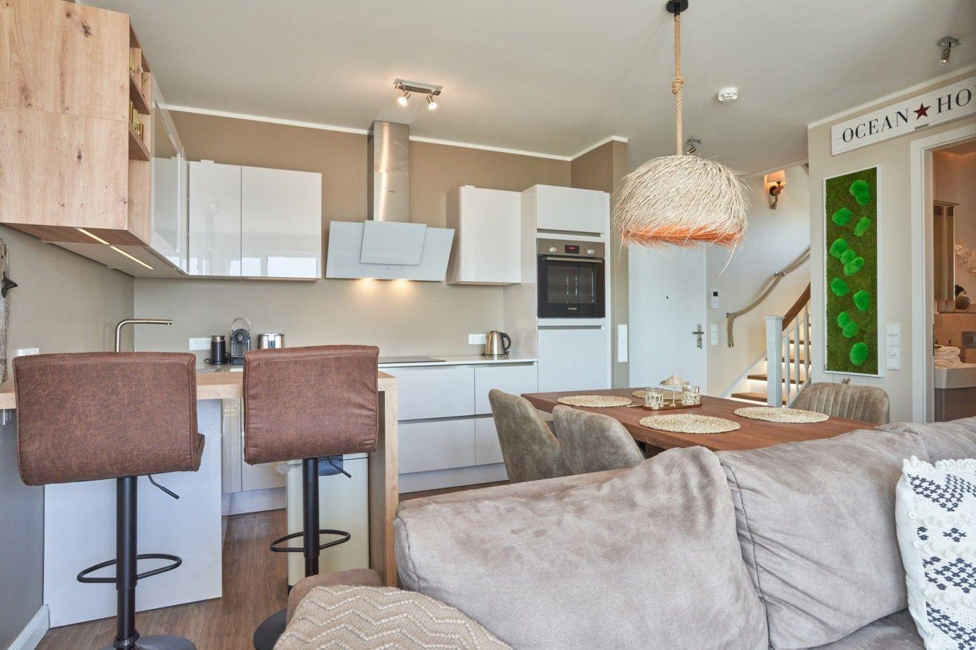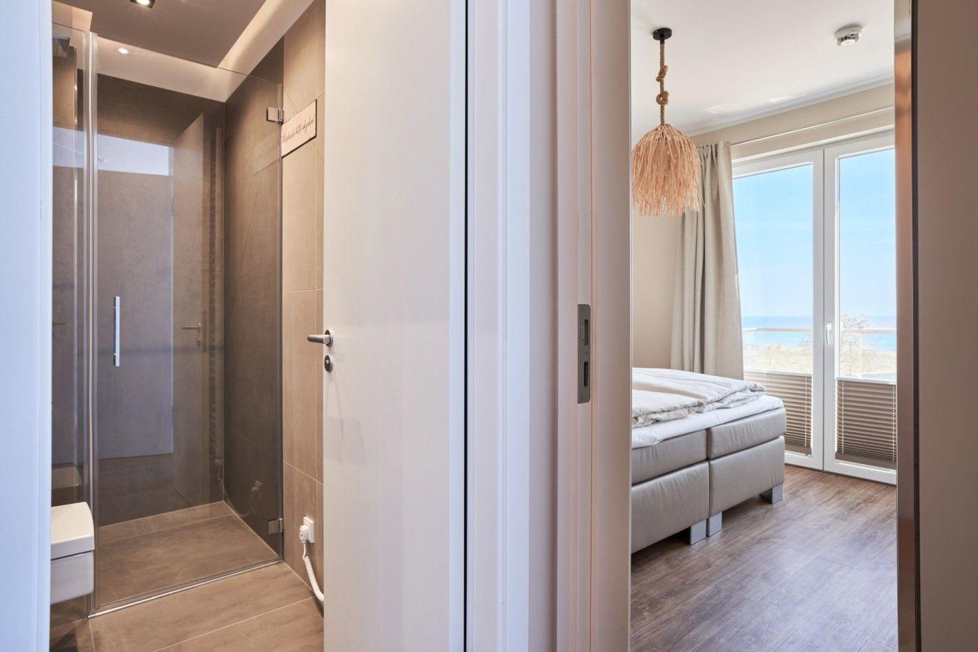 Die Maisonette-Wohnung überzeugt mit einem stilvollen Raumkonzept, hochwertigen Materialien und liebevollen Details. Im liebevoll gestalteten Wohnzimmer mit Kamin lassen sich gemütliche Abende verbringen, während man das Rauschen der Wellen hört oder den Blick auf die Ostsee genießt. Zwei komfortable Schlafzimmer, jeweils ausgestattet mit einem Boxspringbett (1,80 x 2,00 m), einem Smart-TV und beleuchteten Kleiderschränken, sorgen für erholsame Nächte und höchsten Komfort für bis zu vier Personen. Die moderne Küche mit Bartresen und Hockern ist vollständig und hochwertig ausgestattet, inklusive Induktionsherd, Backofen, Geschirrspüler und Kaffeemaschine – und lädt dazu ein, auch im Urlaub kulinarische Momente zu genießen. Ob ein entspanntes Frühstück mit Meerblick oder ein gemeinsames Abendessen im stilvollen Ambiente, hier fehlt es an nichts. Die elegante, beleuchtete Holztreppe führt in die obere Etage und unterstreicht das durchdachte Design der Wohnung. Ein besonderes Highlight sind die zwei modernen Bäder, die mit stilvollem Design und Komfort überzeugen. Eines davon verfügt über eine Sauna und eine Whirlpool-Badewanne und einen stilvollen Wasserbrunnen, die zusammen einen echten Wellnessbereich entstehen lassen - und selbst von hier genießen Sie den direkten Blick auf die Ostsee. Beide Bäder sind mit einer Deckenbeleuchtung in Farblichttherapie ausgestattet sind - perfekt, um nach einem Tag am Meer zur Ruhe zu kommen. Im Obergeschoss befindet sich außerdem ein Homeoffice Arbeitsplatz sowie ein Getränkekühlschrank. Auf dem Balkon genießen Sie den Blick auf die Promenade und die Ostsee. Ein wunderbarer Ort, um den Tag bei einem Glas Wein und dem Klang der Wellen ausklingen zu lassen.