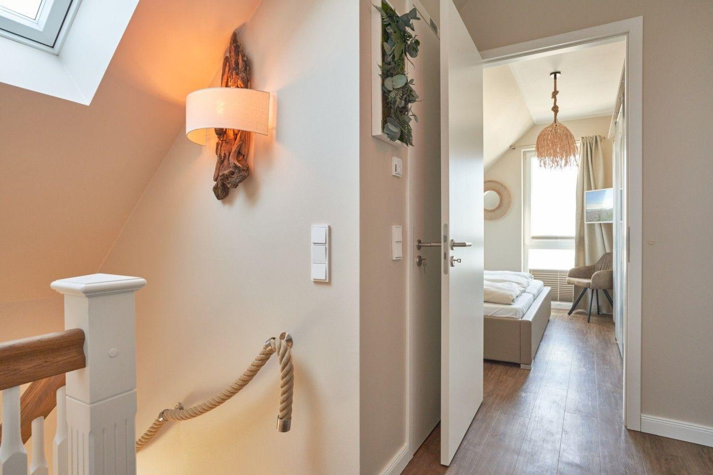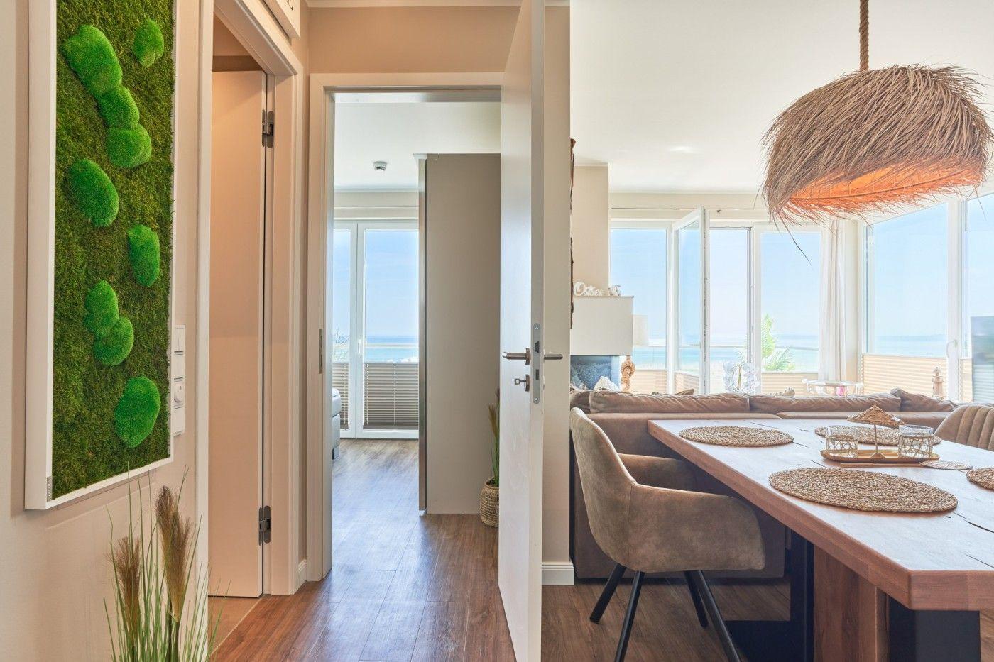 Das Interieur der Ferienwohnung Ocean House vereint nordische Klarheit mit sanfter Boho-Leichtigkeit. Helle Farben, natürliche Materialien und stilvolle Akzente schaffen ein harmonisches Ambiente, das gleichzeitig modern, edel und gemütlich wirkt – ein Ort, der inspiriert und zum Wohlfühlen einlädt.