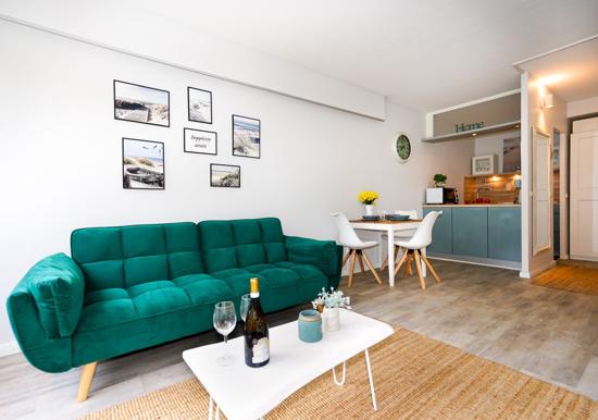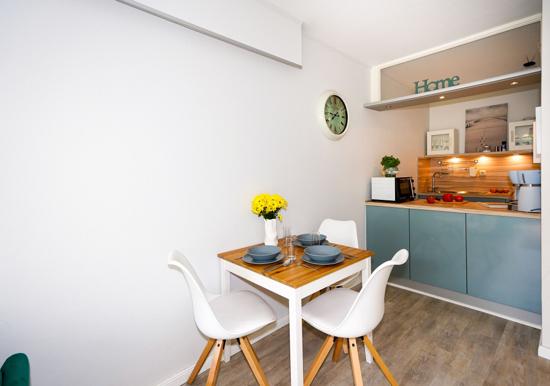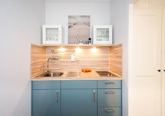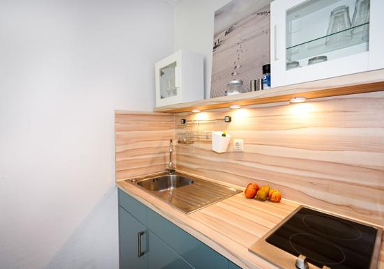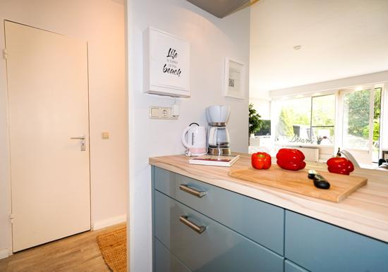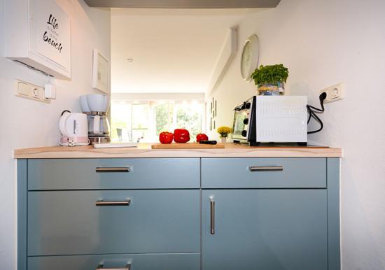 In der charmanten Ferienwohnung erwartet den Gast eine moderne und allergikergeeignete Ausstattung. Der offene Wohnbereich besticht durch ein komfortables Sofa und einen hellen Esstisch, ideal für gesellige Runden. Die vollständig eingerichtete Küche ist mit einem Elektro-/Gasherd, Backofen, Geschirrspüler, Mikrowelle, Kühlschrank und Kaffeemaschine ausgestattet. Ein Gefrierschrank und Toaster bieten zusätzlichen Komfort.
