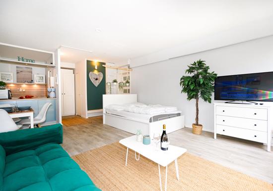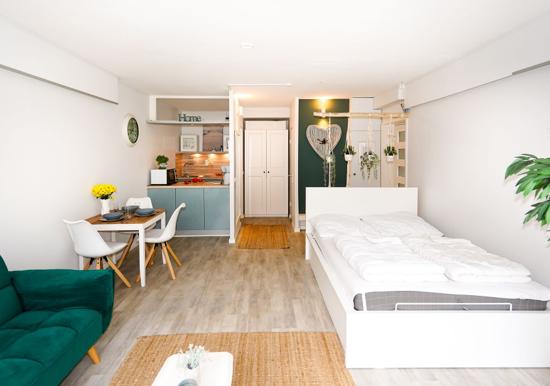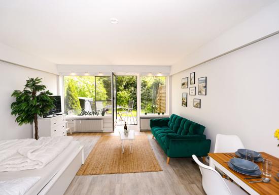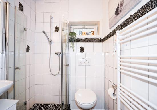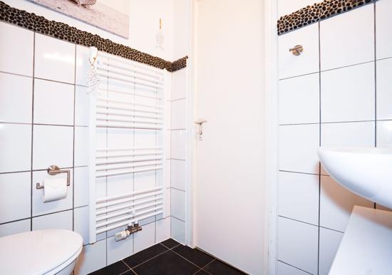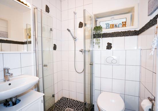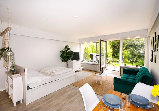 Das Schlafzimmer bietet ein bequemes Doppelbett und ausreichenden Stauraum. Das Badezimmer überzeugt mit einer bodengleichen Dusche, Badewanne, Fenster und modernem Design. Zur technischen Ausstattung gehören ein TV sowie schnelles WLAN mit 25 MBit/s.