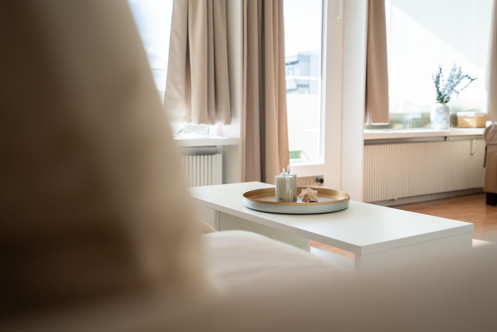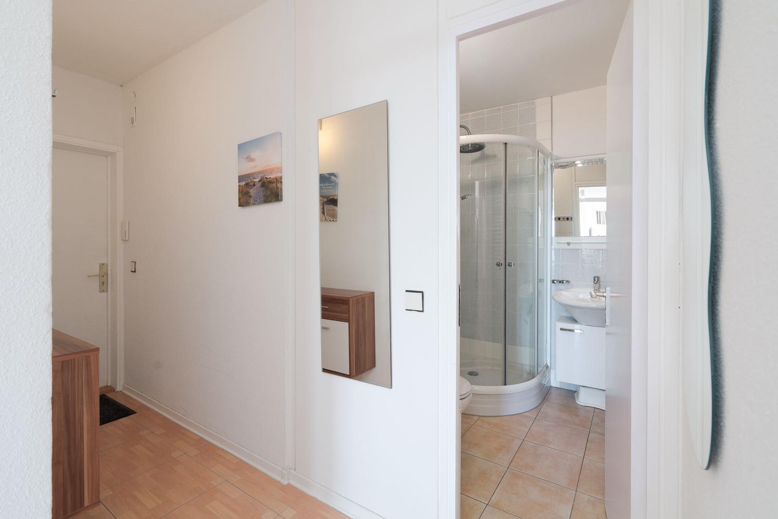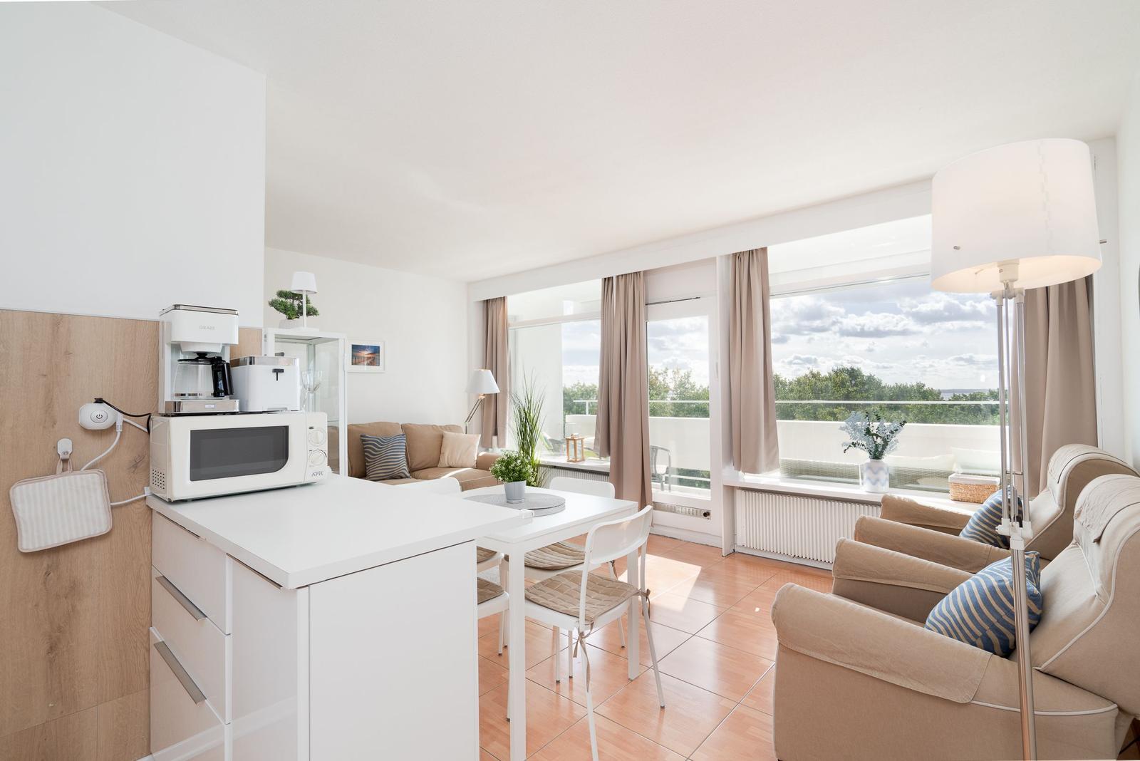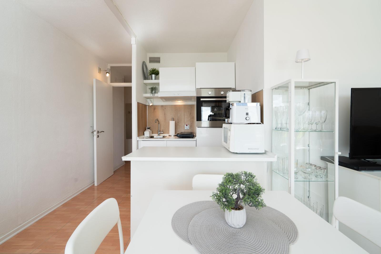 Die Ferienwohnung bietet eine komfortable und allergikergeeignete Ausstattung, perfekt für erholsame Tage. Im offenen Wohn- und Schlafbereich befindet sich ein gemütliches Sofa sowie eine Schlafcouch und ein Doppelbett, die ausreichend Platz für bis zu vier Personen bieten. Die offene Küche ist mit modernen Geräten wie einem Geschirrspüler, Elektro-/Gasherd, Backofen, Mikrowelle, Kühlschrank mit Gefriermöglichkeit, Kaffeemaschine und Toaster ausgestattet, sodass die Zubereitung von Mahlzeiten mühelos gelingt. Ein Esstisch ergänzt den Bereich. Das Duschbad verfügt über einen Haartrockner und bietet zusätzlichen Komfort. Weiterhin sorgt die HiFi-Anlage und der TV für Unterhaltung. Kostenfreies WLAN ist ebenso vorhanden. Für praktische Bedürfnisse stehen Waschmaschine, Wäschetrockner und Wäscheständer zur Verfügung. Ein Parkplatz und ein Fahrstuhl erleichtern den Zugang. Die Wohnung ist optimal für einen entspannten Aufenthalt und lädt zum Wohlfühlen ein.