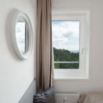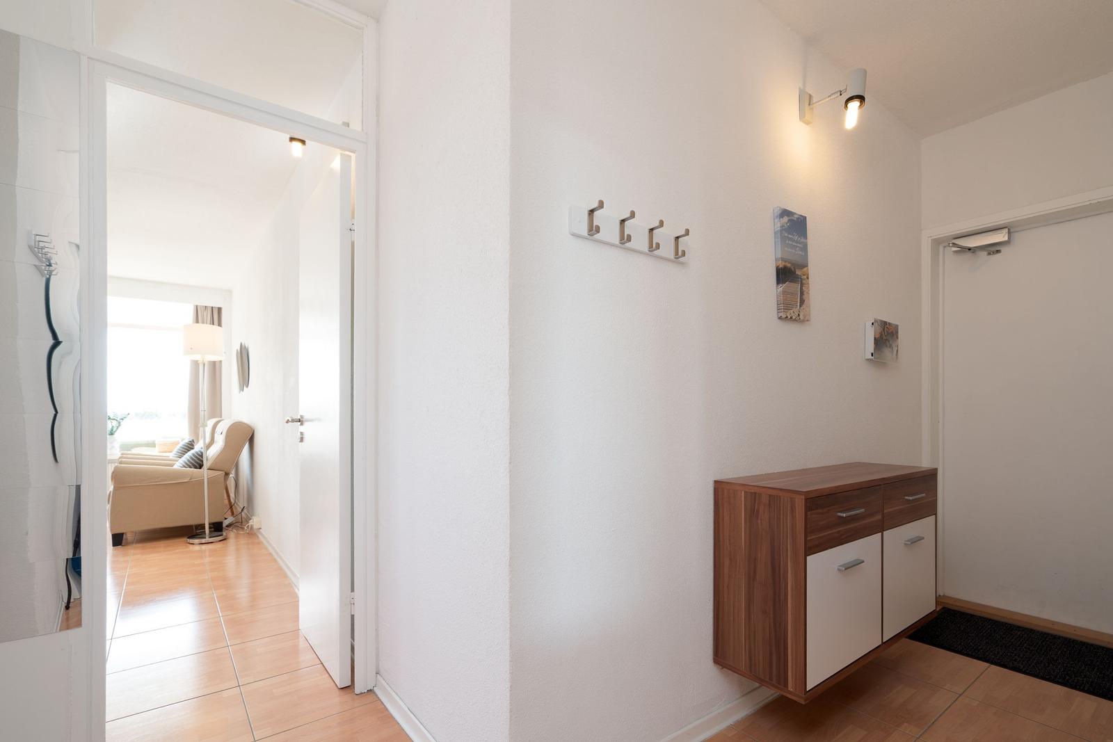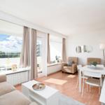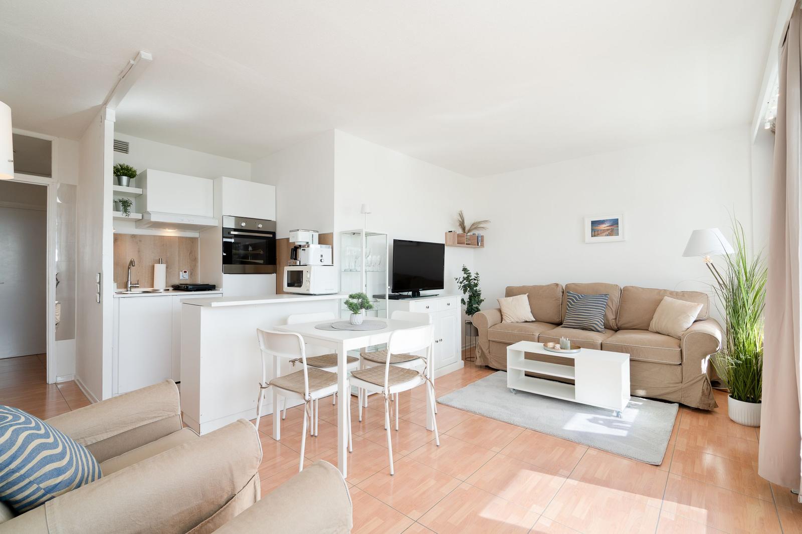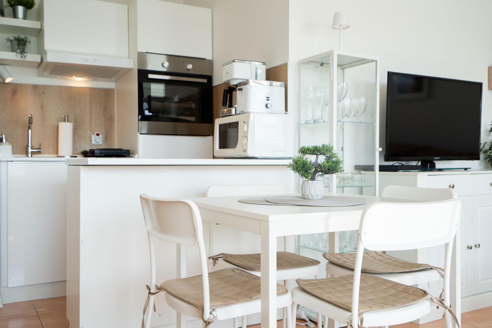 Die Ferienwohnung bietet eine komfortable und allergikergeeignete Ausstattung, perfekt für erholsame Tage. Im offenen Wohn- und Schlafbereich befindet sich ein gemütliches Sofa sowie eine Schlafcouch und ein Doppelbett, die ausreichend Platz für bis zu vier Personen bieten. Die offene Küche ist mit modernen Geräten wie einem Geschirrspüler, Elektro-/Gasherd, Backofen, Mikrowelle, Kühlschrank mit Gefriermöglichkeit, Kaffeemaschine und Toaster ausgestattet, sodass die Zubereitung von Mahlzeiten mühelos gelingt. Ein Esstisch ergänzt den Bereich. Das Duschbad verfügt über einen Haartrockner und bietet zusätzlichen Komfort. Weiterhin sorgt die HiFi-Anlage und der TV für Unterhaltung. Kostenfreies WLAN ist ebenso vorhanden. Für praktische Bedürfnisse stehen Waschmaschine, Wäschetrockner und Wäscheständer zur Verfügung. Ein Parkplatz und ein Fahrstuhl erleichtern den Zugang. Die Wohnung ist optimal für einen entspannten Aufenthalt und lädt zum Wohlfühlen ein.